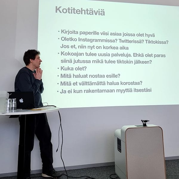 Esitelmänsä päätteeksi Strömman antoi opiskelijoille – ja miksei kaikille paikalla olleille – brändäämiseen liittyvän kotitehtävän, joka näkyy oheisessa kuvassa. Kun luin tuota listaa, aloin välittömästi miettiä, millaisia asioita omassa henkilöbrändissäni korostaisin. Uskon, että sama aivovoimistelu alkoi kaikkien läsnäolijoiden päässä.