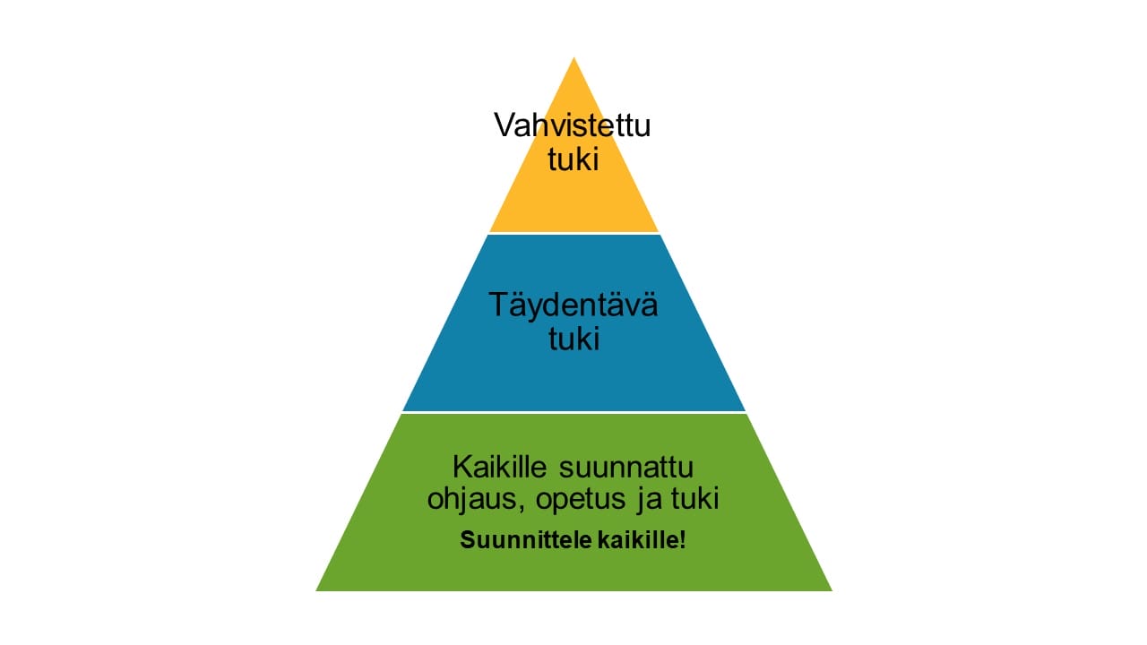 Oppimisen tuen mallia kuvataan kolmiolla (kuva 1). Alin osa muodostaa kivijalan, jonka varaan oppimisen tuki rakentuu. Kaikille suunnattu tuki ja ohjaus sisältää esimerkiksi opintojaksoilla annettavaa yleistä pedagogista tukea. Lisäksi siihen kuuluu opiskelussa tarvittavien taitojen vahvistamista erilaisilla oppimista ja opiskelukykyä tukevilla opintojaksoilla ja työpajoissa.