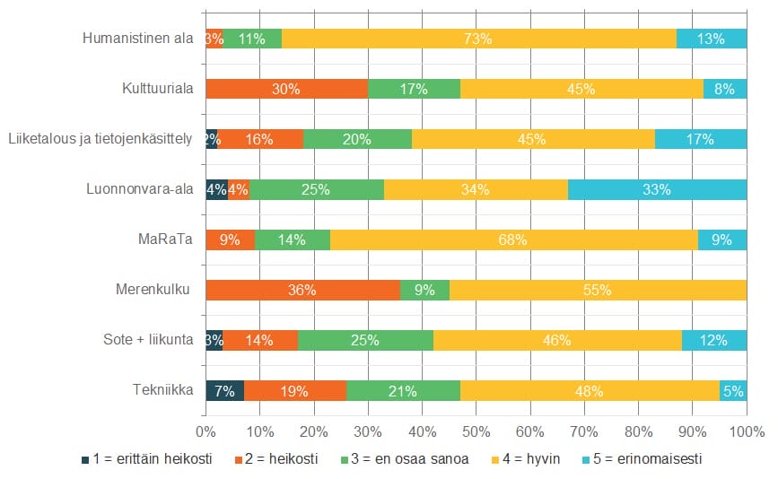 Kevään aikana kävi kuitenkin selväksi, että valmiudet etäopetukseen olivat eri opettajilla ja eri koulutusyksiköissä hyvin erilaisia. Tämä on ymmärrettävää siksi, että verkko-opetuksen määrä vaihtelee eri aloilla. Esimerkiksi rakennus- ja energiatekniikan koulutusyksikön opetuksesta keväällä 2020 oli suunniteltu verkko-opetukseksi alle 9%, kun vastaavasti liiketaloudessa yli 46% opinnoista on lähtökohtaisesti verkko-opetusta. Lähiopetuksen tarve on myös erilainen eri aloilla ja eri aiheissa.