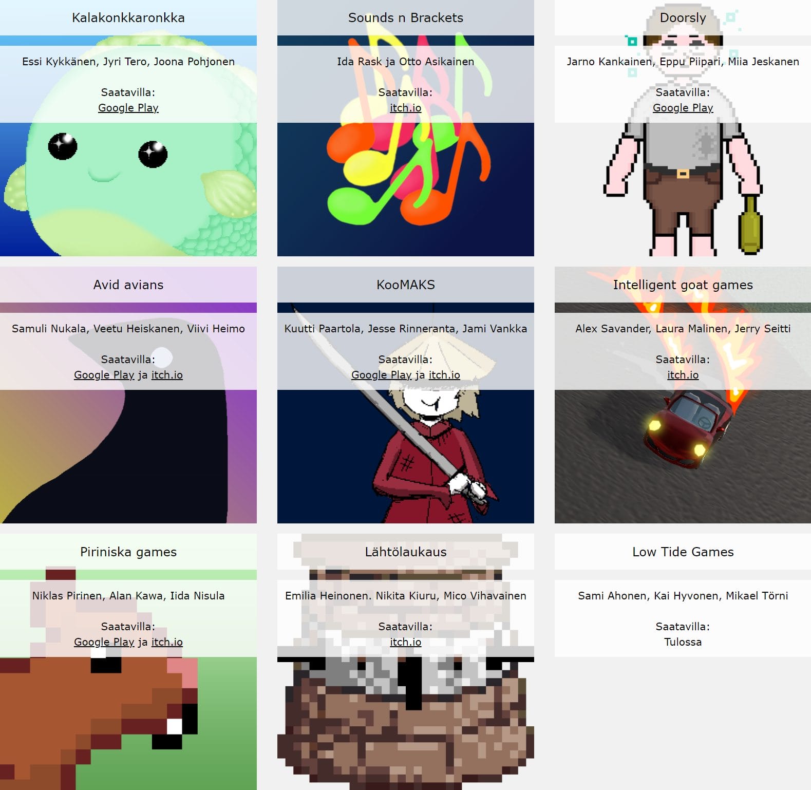 Joulukuun puolessa välissä yhdeksästä tuotteesta on ladattavissa Google Play -kaupassa tai Itch.io -pelien julkaisupaikassa.