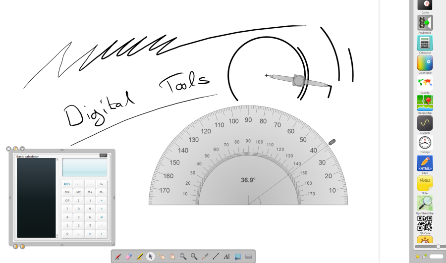 Lisäksi, kun lataa koneelleen esimerkiksi ilmaisen OpenBoard-ohjelmiston tai käyttää verkon yli vaikkapa AWW Boardia, niin saa mukaan paljon näppäriä lisätoiminnallisuuksia. Itse suosin OpenBoardia, josta löytyy runsaasti erilaisia työkaluja esimerkiksi matematiikan perusopetukseen ja miksei muuhunkin, kuten kuvassa 2.