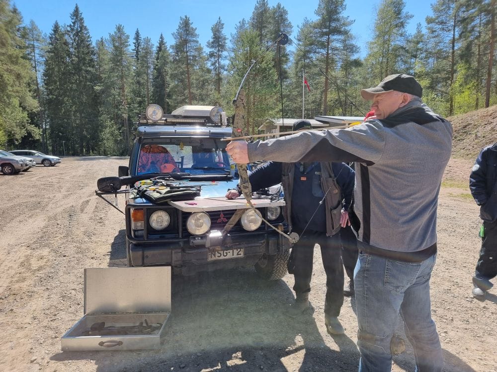 Tyrrissä kokeiltiin myös jousiammuntaa, mikä on miellyttävän hiljaista ja ekologista – ja myös alkuperäisintä metsästys- ja ampumaurheilua. Jousella tähtäämisen harjoitteluun meni hetki, mutta kun idean oppi, oli osumatarkkuuskin tyydyttävä.