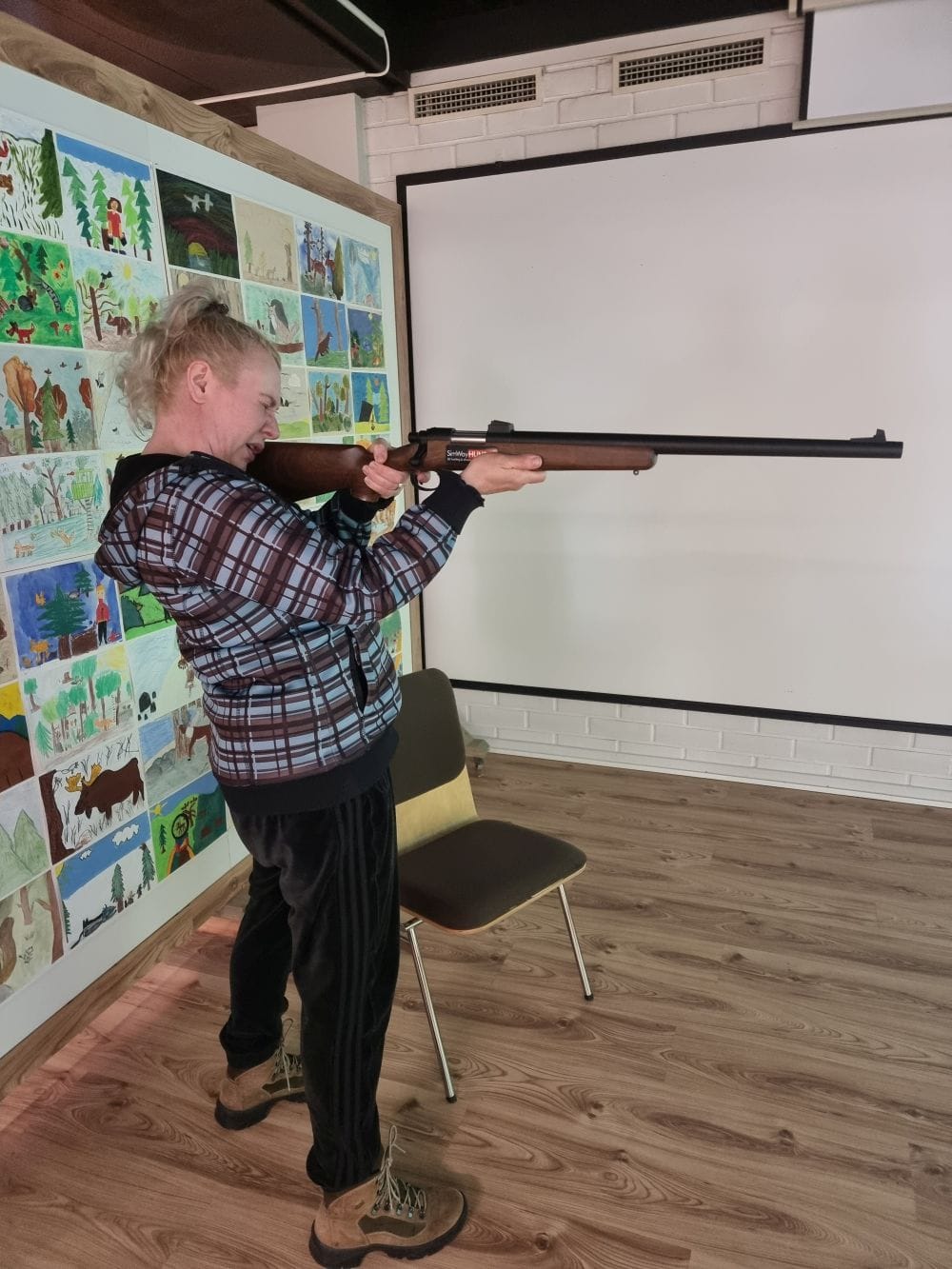 Voikkaan luonto- ja eräkeskuksen tiloissa ammuttiin myös laser-simulaattoreilla, joissa aseistuksena on kivääri, haulikko ja pistooli.