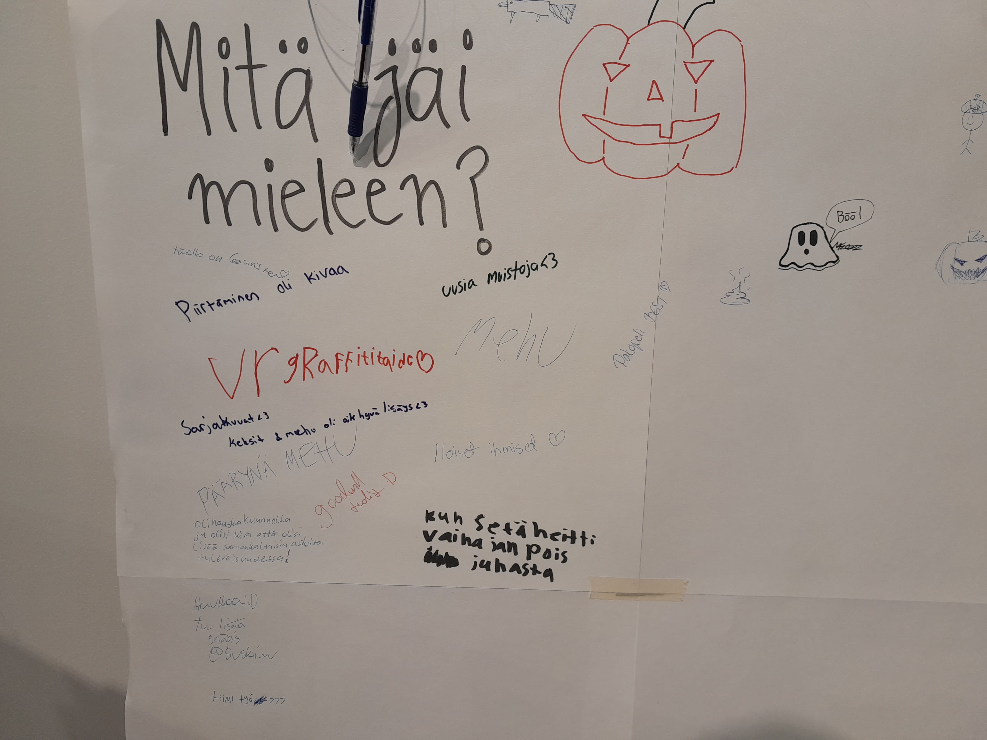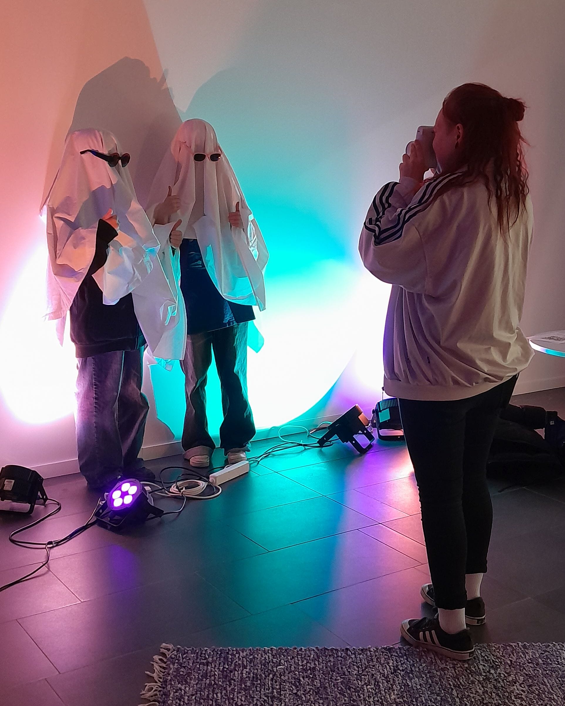 Tilassa tehtiin virtuaalisia graffiteja ja taiteiltiin yhteisöllistä maalausta, pidettiin tietovisoja sekä pelattiin. Osallistujat pääsivät ilmaisemaan itseään runoja rustaamalla, keksejä koristelemalla sekä ottamaan itsestään polaroid-kuvia kummituksina taustallaan seinälle projisoidut kuvat ja värivalot.