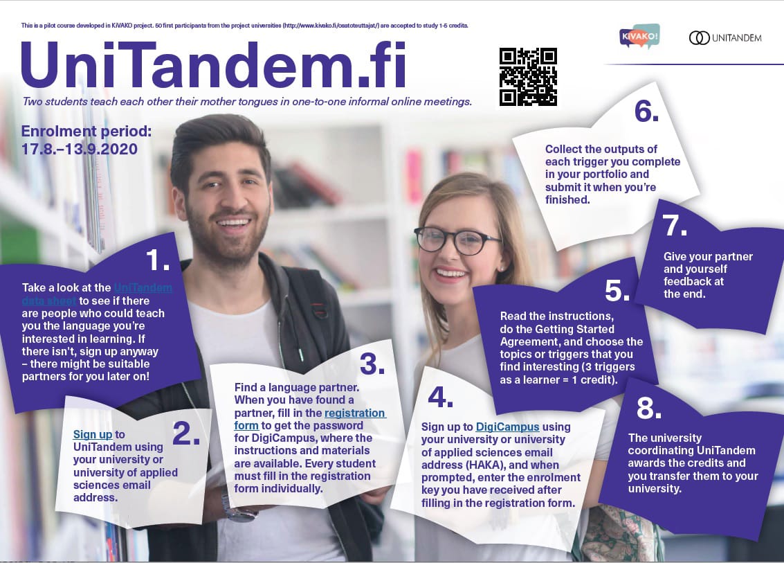 KiVAKO-hankeeseen kuuluu myös UniTandem, korkeakoulujen yhteinen verkkotandem, jossa opiskelijat opettavat omaa äidinkieltä toiselle ja opiskelevat tandem-parinsa kieltä kahdenkeskisissä verkkotapaamisissa. Sopivan tandem-parin löytämistä varten Tampereen AMK:n opiskelijat kehittivät UniTandemiin erillisen sovelluksen. Opiskelu tapahtuu digicampus-alustalla olevien aihekohtaisten aktiviteettien ns. triggerien avulla, joita hankkeessa on luotu eri kielitaidon tasoille. Triggerien laatimisessa haasteena on ollut se, että ne on ollut pakko laatia kielestä riippumattomiksi. Koska kielet ovat erilaisia, triggerien soveltuvuudesta eri kieliin odotetaankin palautetta pilotissa.