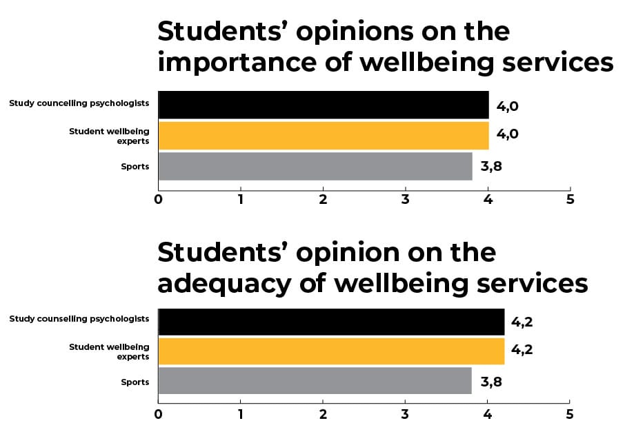 According to the customer feedback survey in 2019 concerning services, students find that the services of study counselling psychologists and student wellbeing experts as well as the sports services are rather important and rather adequate. The results of the 2019 survey are shown in the figure below. On a scale from one to five, the average score for the importance of services is 4.0 for study counselling psychologists, 4.0 for student wellbeing experts and 3.8 for sports services. The respective average scores from students on the adequacy of services are 4.2, 4.2 and 3.8. The survey is carried out every two years. We aim for higher average scores in the next survey to be carried out in 2021.