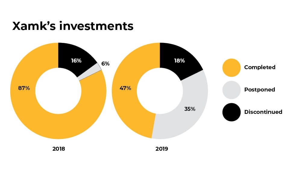 Of the investments made, 16 were completed by the end of 2019. The implementation or completion of 12 investments was postponed to the following year. A decision was made not to implement six of the proposed investments.